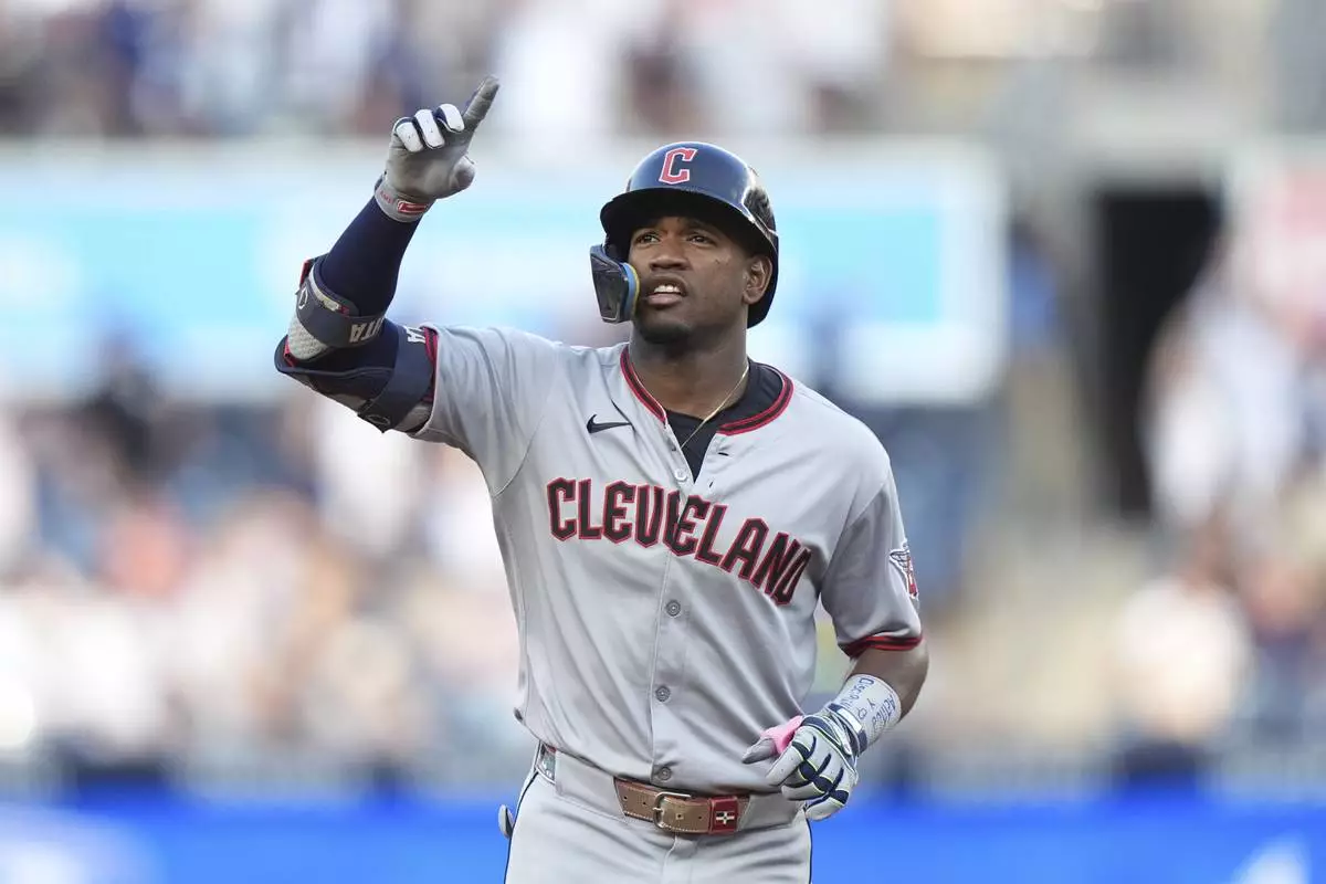 Cleveland Guardians' Angel Martínez gestures as he runs the bases after hitting a two-run home run during the first inning of a baseball game against the New York Yankees, Wednesday, June 4, 2025, in New York. (AP Photo/Frank Franklin II)