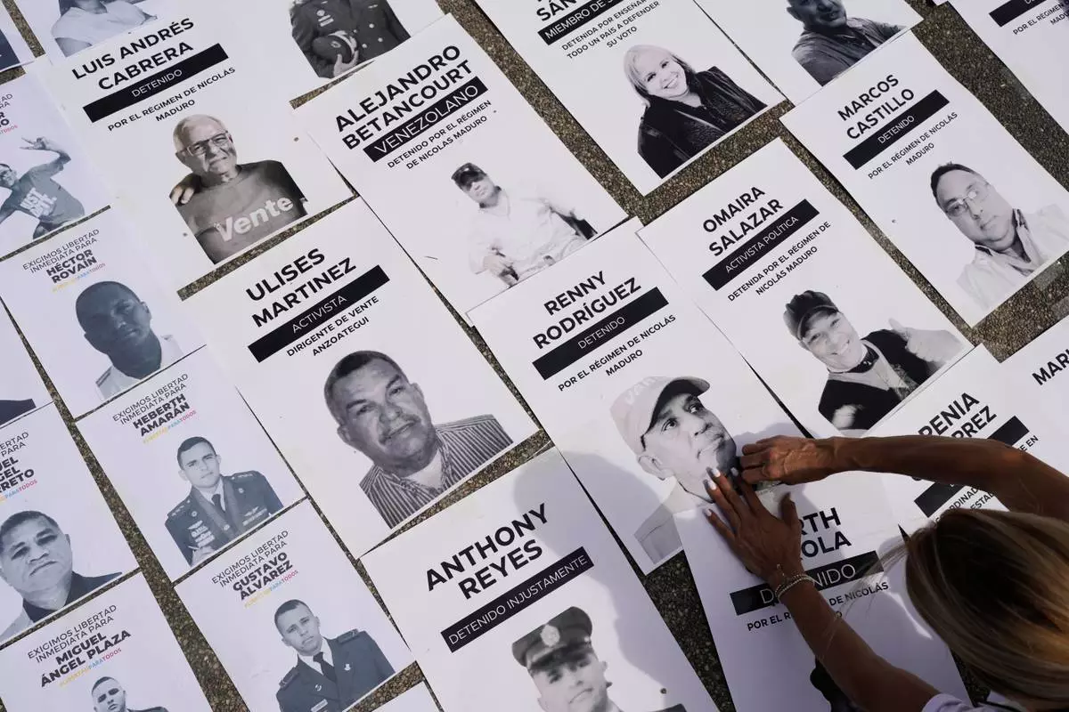 Jacklin Ibarreto, whose father Miguel Ibarreto is detained, lays out photos of political prisoners at the Central University of Venezuela in Caracas, Venezuela, Tuesday, Jan. 13, 2026. (AP Photo/Matias Delacroix)