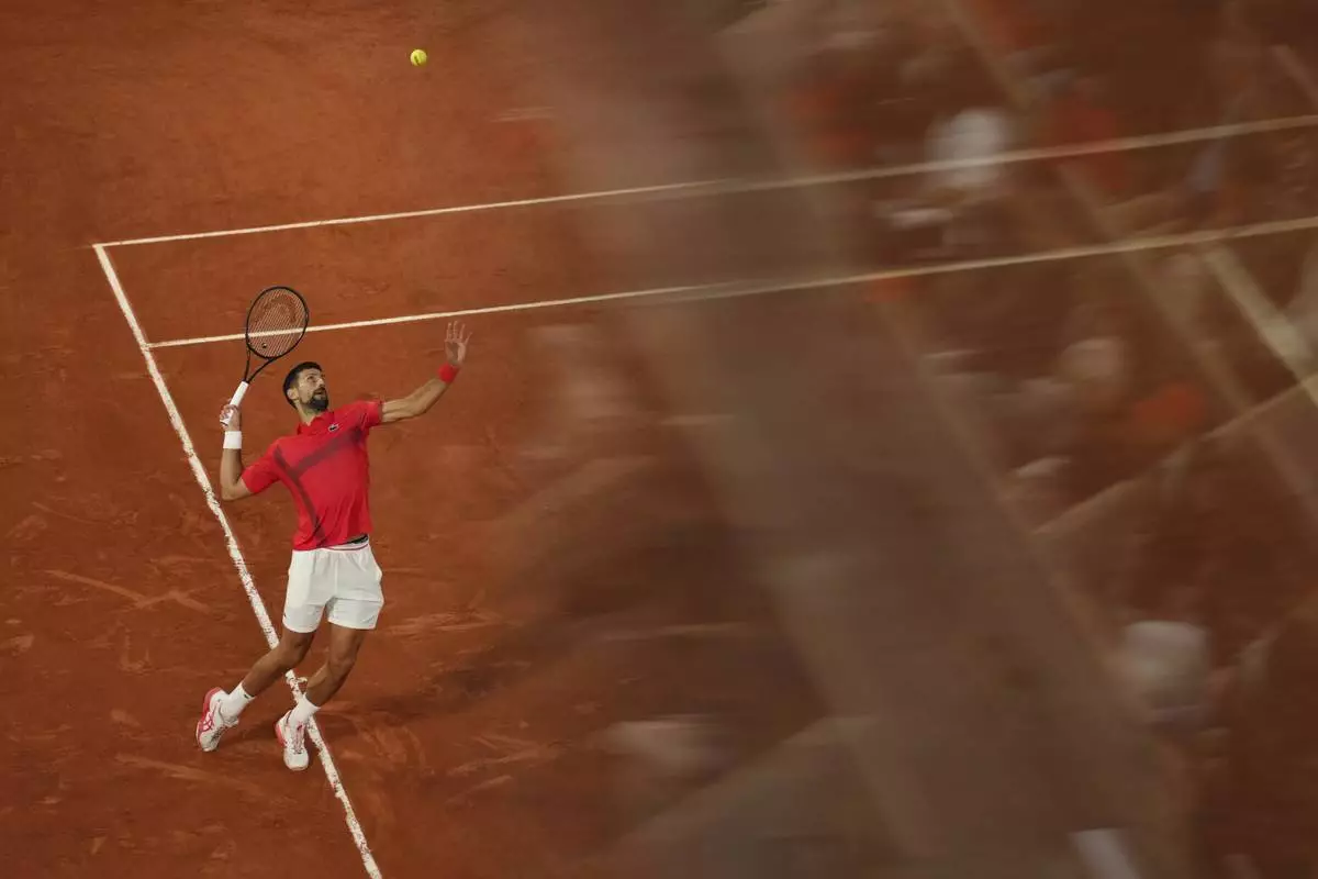 Serbia's Novak Djokovic serves against Germany's Alexander Zverev during their quarterfinal match of the French Tennis Open at the Roland-Garros stadium in Paris, Wednesday, June 4, 2025. (AP Photo/Lindsey Wasson)