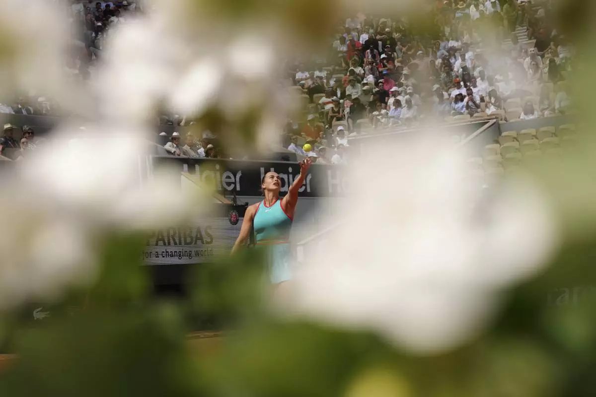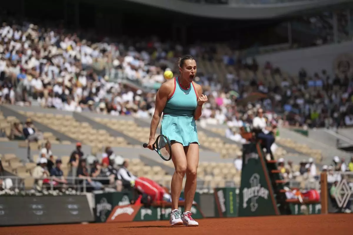 Aryna Sabalenka of Belarus reacts as she plays against China's Qinwen Zheng during their quarterfinal match of the French Tennis Open at the Roland-Garros stadium in Paris, Tuesday, June 3, 2025. (AP Photo/Christophe Ena)