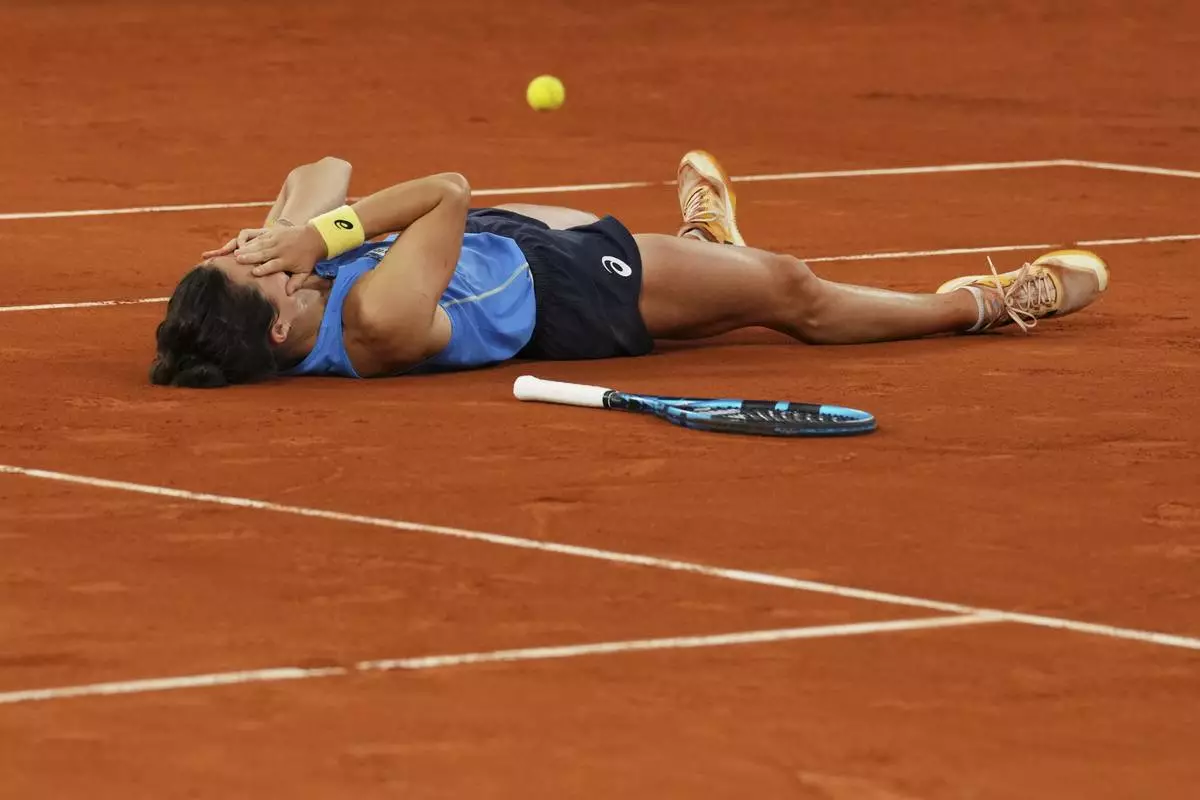 France's Lois Boisson reacts as she won the quarterfinal match of the French Tennis Open against Russia's Mirra Andreeva at the Roland-Garros stadium in Paris, Wednesday, June 4, 2025. (AP Photo/Aurelien Morissard)