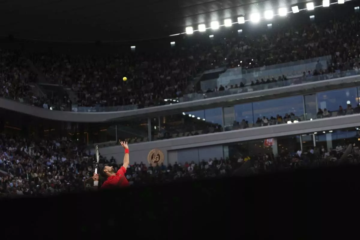 Spectators are reflected in a glass as Serbia's Novak Djokovic plays a shot against Germany's Alexander Zverev during their quarterfinal match of the French Tennis Open at the Roland-Garros stadium in Paris, Wednesday, June 4, 2025. (AP Photo/Aurelien Morissard)