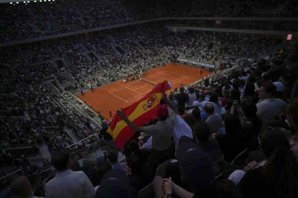 A fan holds Spain's flag during the quarterfinal match of the French Tennis Open between Tommy Paul of the U.S. and Spain's Carlos Alcaraz at the Roland-Garros stadium in Paris, Tuesday, June 3, 2025. (AP Photo/Thibault Camus)