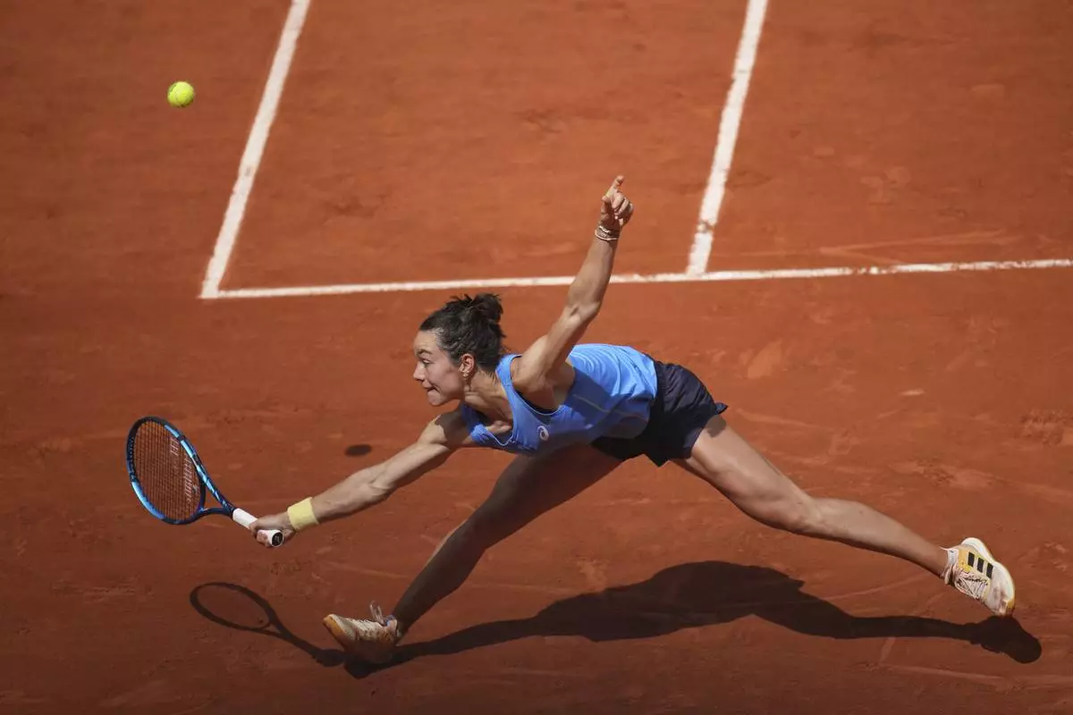 France's Lois Boisson plays a shot against Jessica Pegula of the U.S. during their fourth round match of the French Tennis Open at the Roland-Garros stadium in Paris, Monday, June 2, 2025. (AP Photo/Christophe Ena)