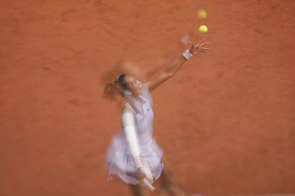 Russia's Mirra Andreeva prepares to serve against Australia's Daria Kasatkina during their fourth round match of the French Tennis Open at the Roland-Garros stadium in Paris, Monday, June 2, 2025. (AP Photo/Christophe Ena)