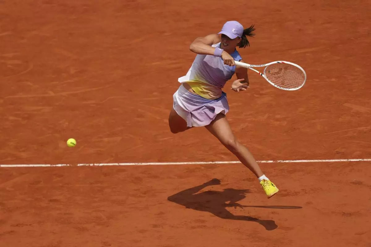 Poland's Iga Swiatek plays a shot against Ukraine's Elina Svitolina during their quarterfinal match of the French Tennis Open at the Roland-Garros stadium in Paris, Tuesday, June 3, 2025. (AP Photo/Aurelien Morissard)