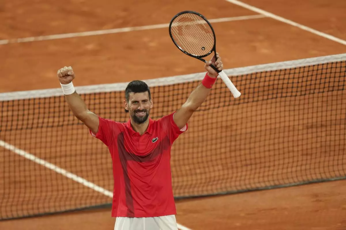 Serbia's Novak Djokovic celebrates as he won the quarterfinal match of the French Tennis Open against Germany's Alexander Zverev at the Roland-Garros stadium in Paris, Wednesday, June 4, 2025. (AP Photo/Aurelien Morissard)