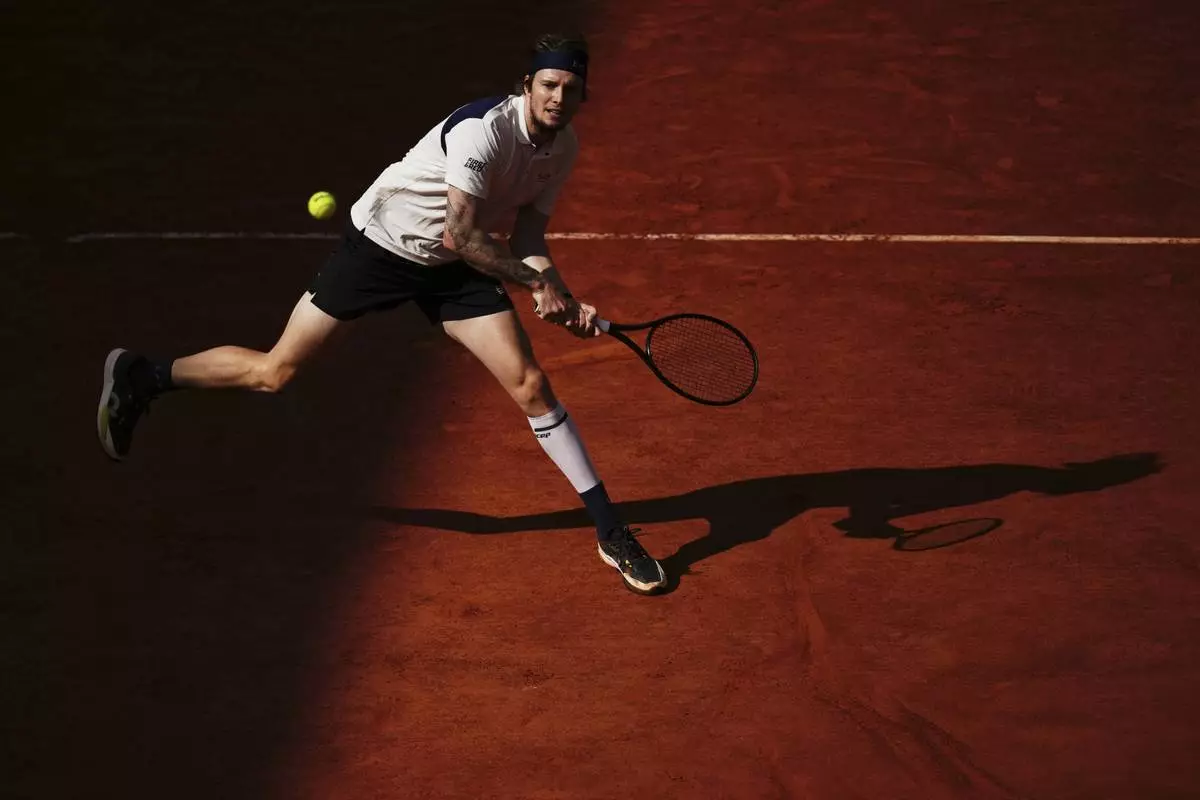 Kazakhstan's Alexander Bublik plays a shot against Britain's Jack Draper during their fourth round match of the French Tennis Open at the Roland-Garros stadium in Paris, Monday, June 2, 2025. (AP Photo/Christophe Ena)