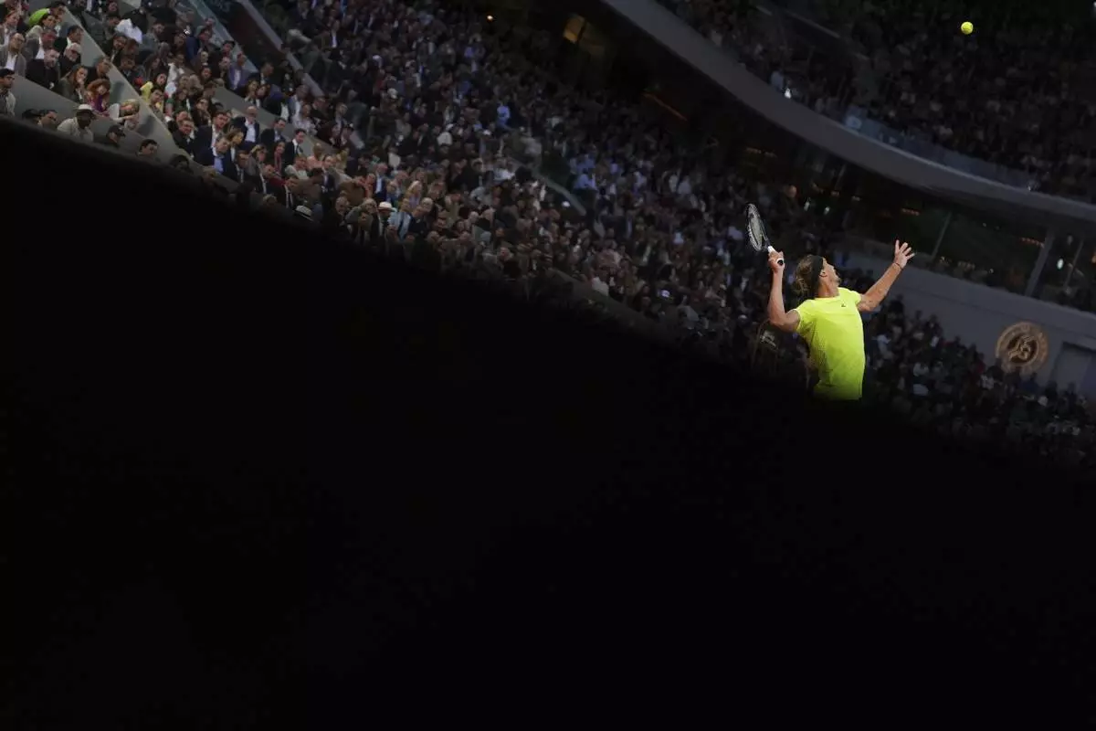 Serbia's Novak Djokovic prepares to serve against Germany's Alexander Zverev during their quarterfinal match of the French Tennis Open at the Roland-Garros stadium in Paris, Wednesday, June 4, 2025. (AP Photo/Lindsey Wasson)