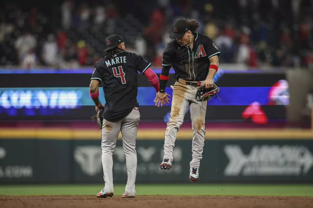 Arizona Diamondbacks second baseman Ketel Marte (4) and outfielder Alek Thomas, right, celebrate after a win against the Atlanta Braves, Wednesday, June 4, 2025, in Atlanta. (AP Photo/Colin Hubbard)
