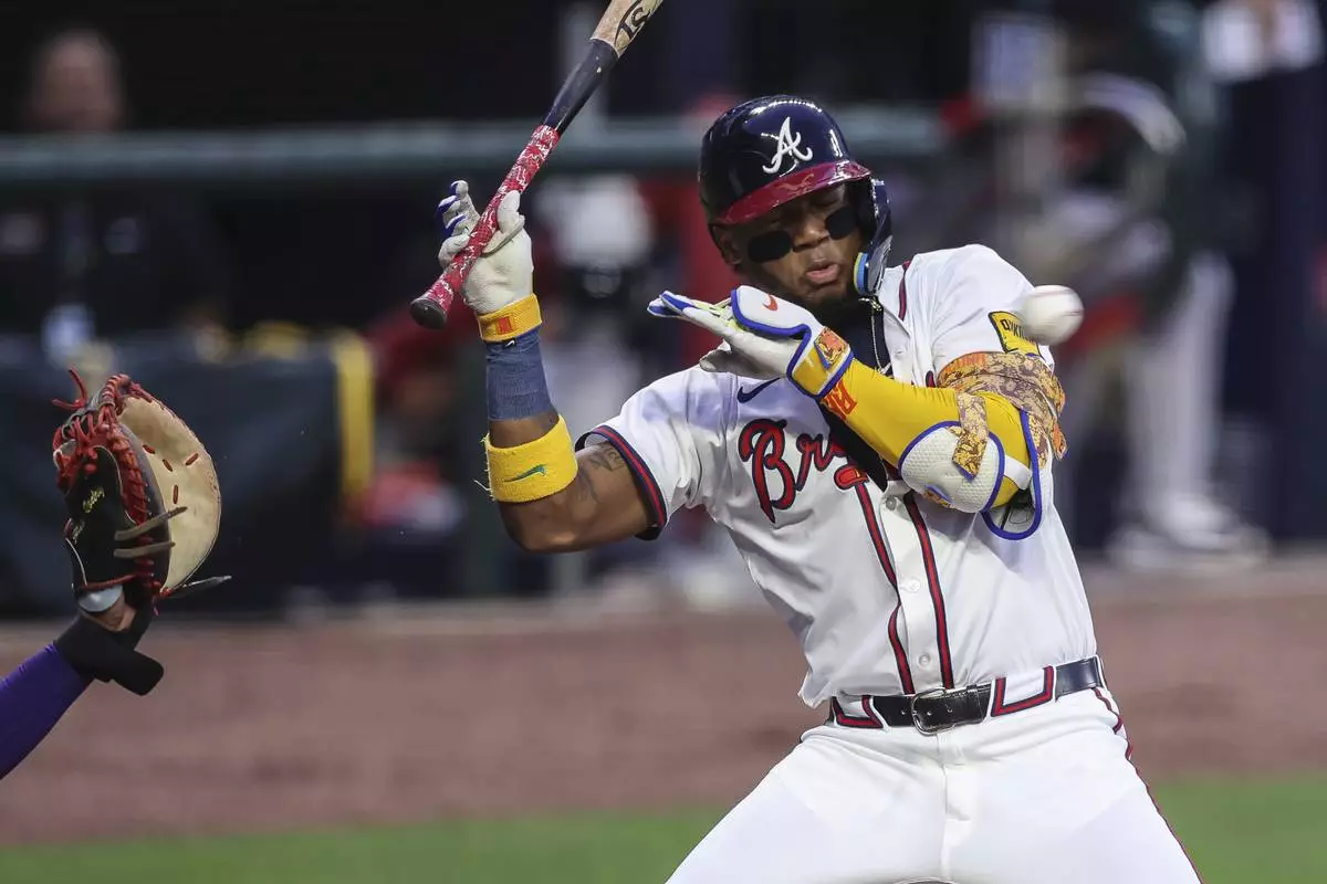 Atlanta Braves' Ronald Acuña Jr. tries to avoid a pitch in the first inning of a baseball game against the Arizona Diamondbacks, Wednesday, June 4, 2025, in Atlanta. (AP Photo/Colin Hubbard)