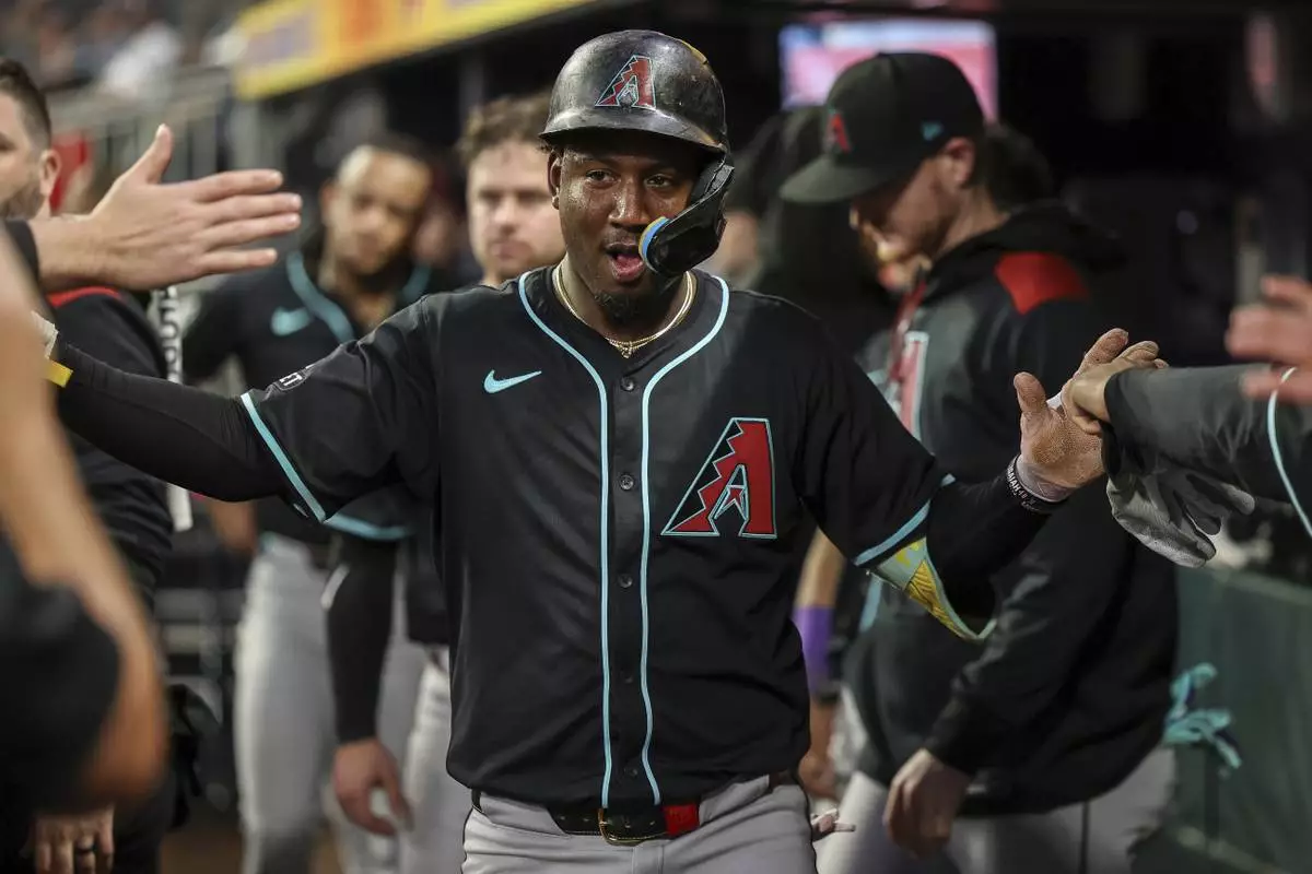 Arizona Diamondbacks' Geraldo Perdomo high-fives teammates in the dugout after scoring a run in the third inning of a baseball game against the Atlanta Braves, Wednesday, June 4, 2025, in Atlanta. (AP Photo/Colin Hubbard)