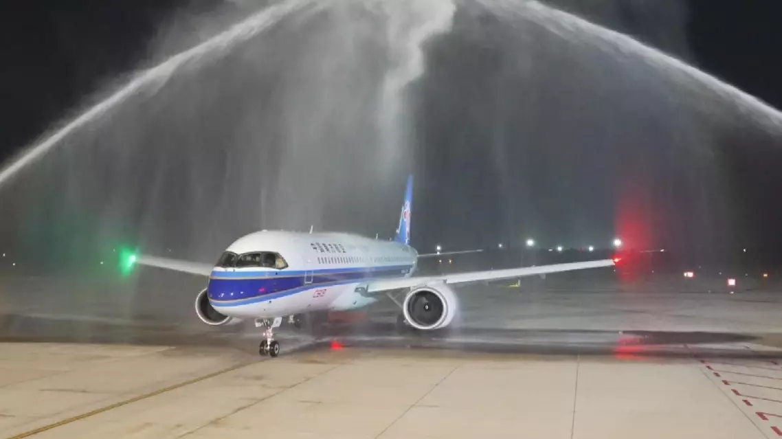 The C919-operated China Southern Airlines flight CZ3383, carrying 139 passengers, landed at the Jiangying Airport in Nanyang City of central China's Henan Province at 23:57 local time. The newly built airliner has ensured a smooth and stable trip, according to passengers.
