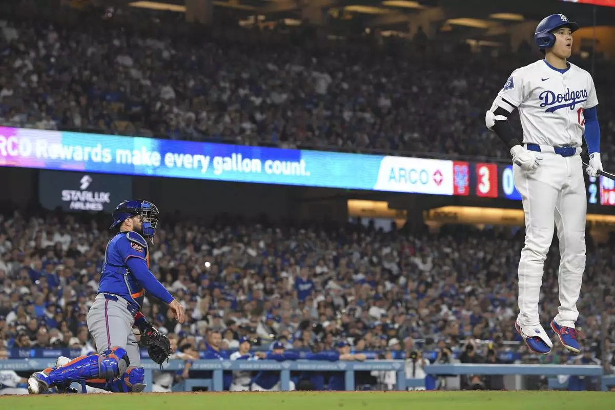Los Angeles Dodgers' Shohei Ohtani, right, jumps after taking a strike as New York Mets catcher Luis Torrens kneels at the plate during the fifth inning of a baseball game Wednesday, June 4, 2025, in Los Angeles. (AP Photo/Mark J. Terrill)