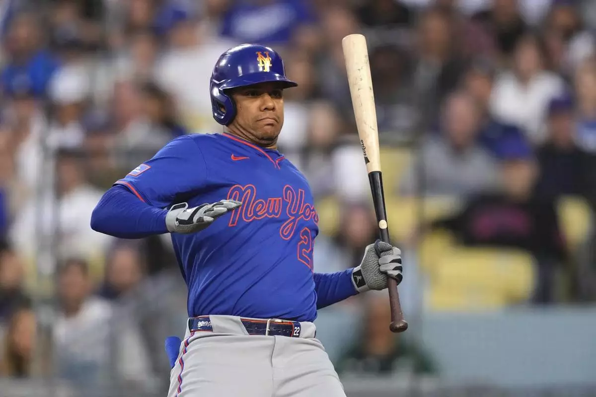 New York Mets' Juan Soto takes a close pitch during the third inning of a baseball game against the Los Angeles Dodgers, Wednesday, June 4, 2025, in Los Angeles. (AP Photo/Mark J. Terrill)