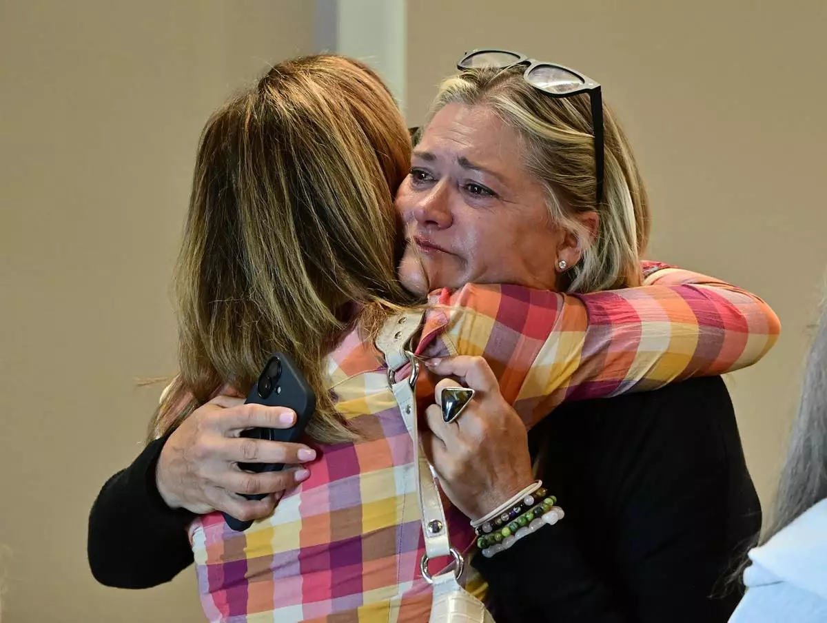 Lesli Colin Johnsen, right, hugs Beth Blacker before a community vigil at the Boulder Jewish Community Center, Wednesday, June 4, 2025, in Boulder, Colo. (Andy Cross/The Denver Post via AP, Pool)