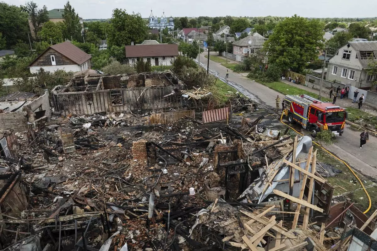 Residential houses are seen destroyed after a Russian drone strike in Pryluky village, Ukraine, Thursday, June 5, 2025. (AP Photo/Evgeniy Maloletka)