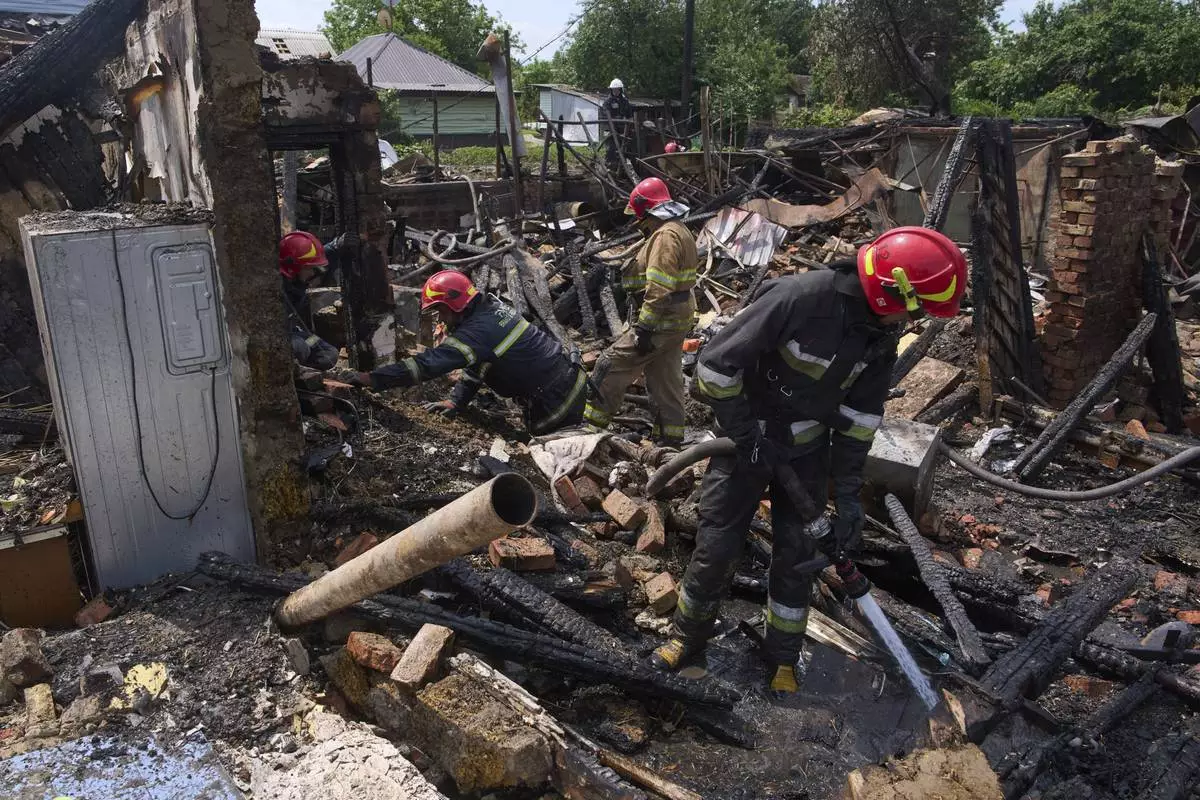 Rescue workers extinguish a fire of a house destroyed by a Russian drone strike in Pryluky village, Ukraine, Thursday, June 5, 2025. (AP Photo/Evgeniy Maloletka)