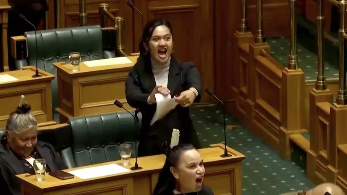 This image from May 15, 2025 video shows New Zealand lawmaker Hana-Rāwhiti Maipi-Clarke performing a Māori haka to protest a proposed law in Parliament, in Wellington, New Zealand, (New Zealand Parliament TV via AP)