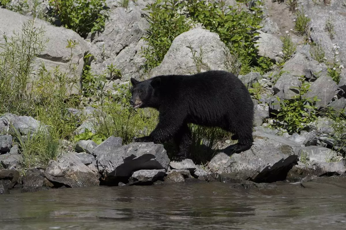 A black bear walks along a rocky bank of the Klamath River, Thursday, Sept. 19, 2024, in Humboldt County, Calif. (AP Photo/Godofredo A. Vásquez)