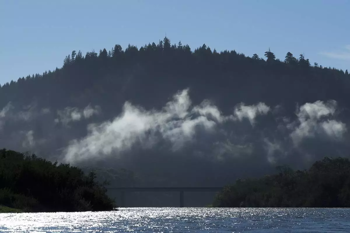 Highway 101 is seen in the distance while traveling on the Klamath River, Thursday, Sept. 19, 2024, in Klamath, Calif. (AP Photo/Godofredo A. Vásquez)