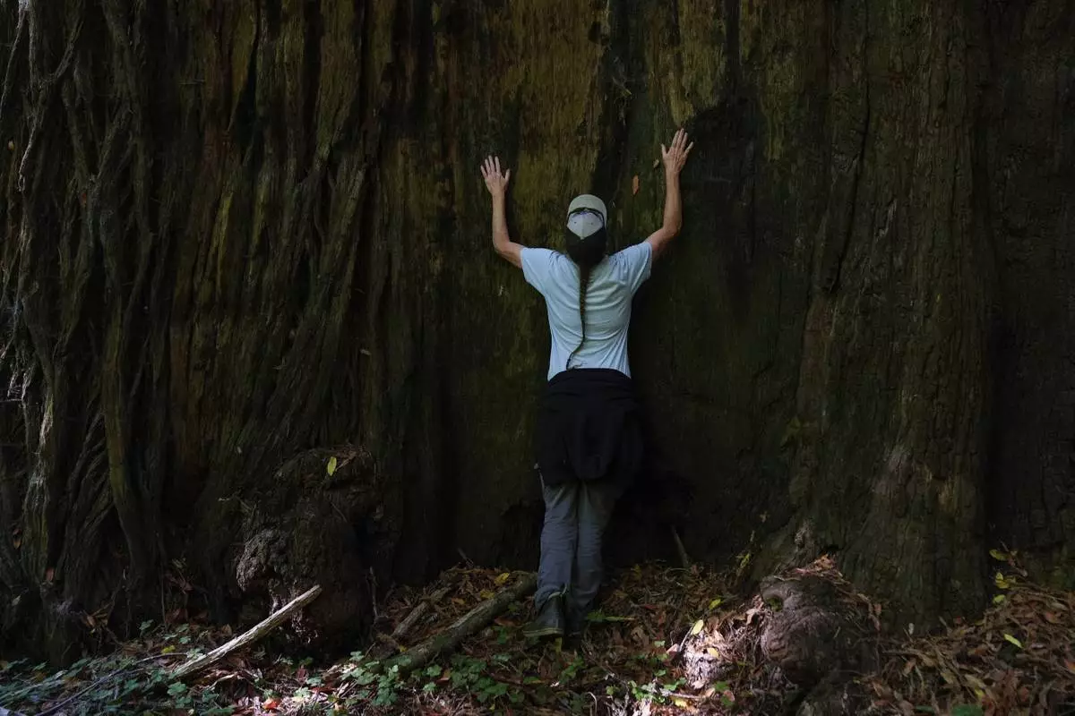 Sarah Beesley, fisheries biologist for the Yurok Tribe, hugs a tree located in land that will be returned to the Yurok Tribe, Thursday, Sept. 19, 2024, in Humboldt County, Calif. (AP Photo/Godofredo A. Vásquez)