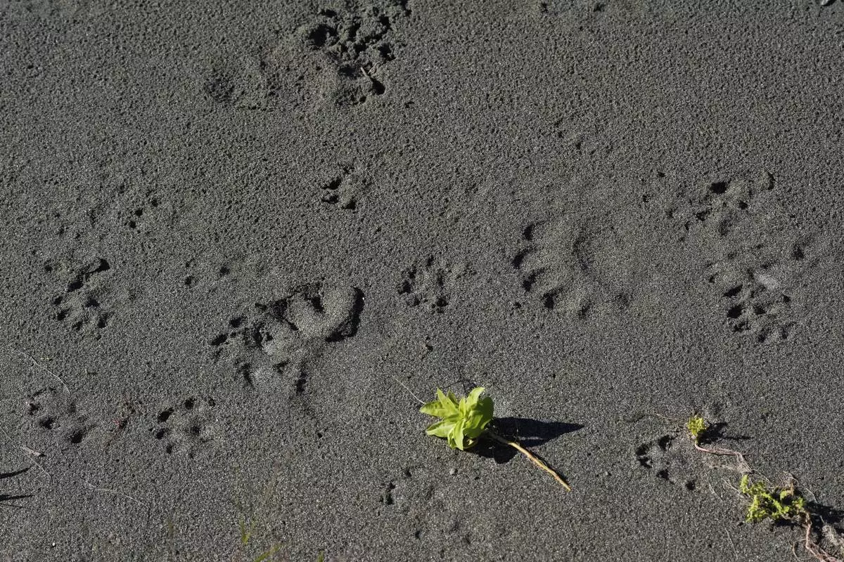 Wildlife footprints are visible on a bank of the Klamath River, Thursday, Sept. 19, 2024, in Humboldt County, Calif. (AP Photo/Godofredo A. Vásquez)