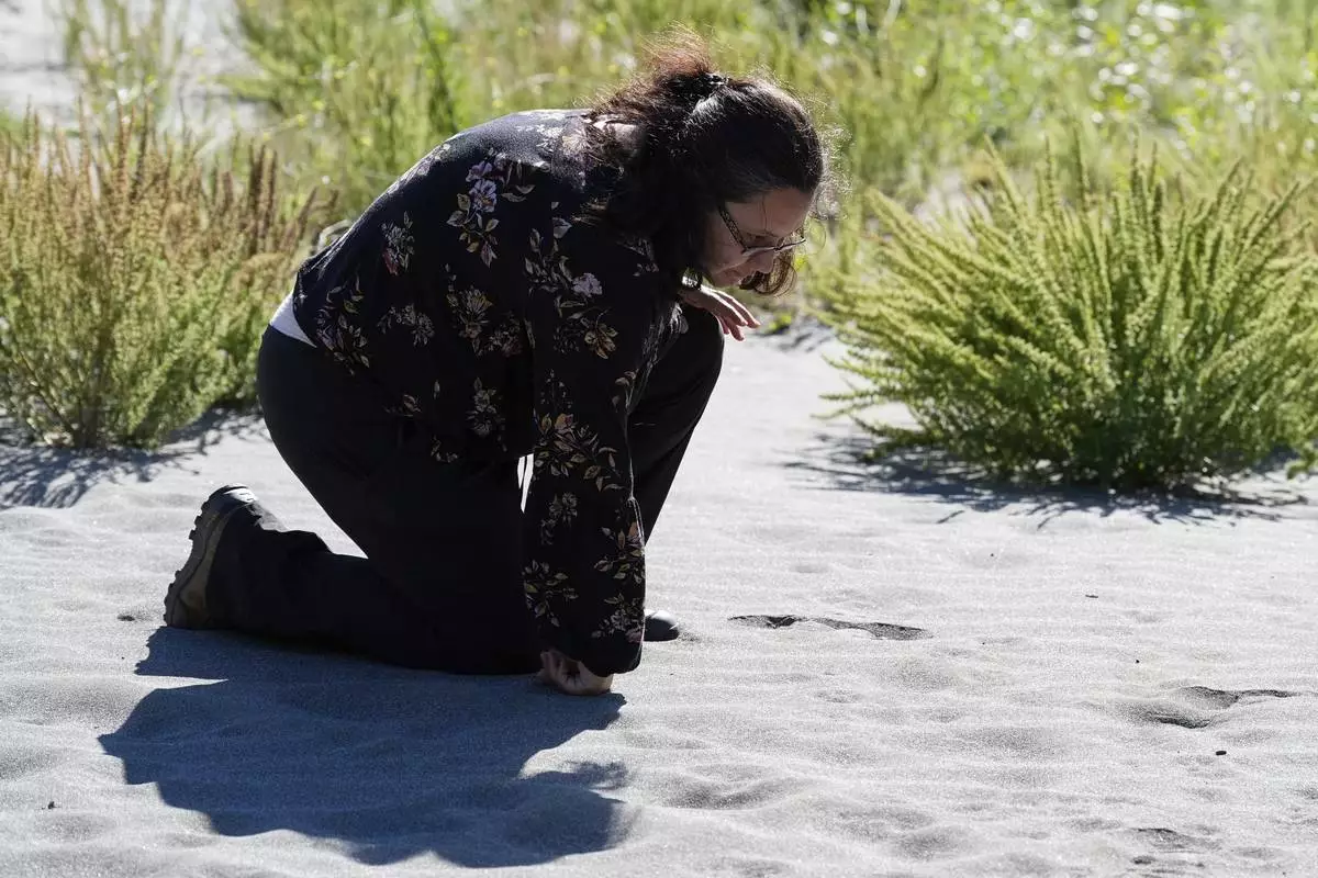 Tiana Williams-Claussen, director of the Yurok Tribe Wildlife Department, looks at footprints she believed to be of a black bear while walking on land that will be returned to the tribe Thursday, Sept. 19, 2024, in Humboldt County, Calif. (AP Photo/Godofredo A. Vásquez)