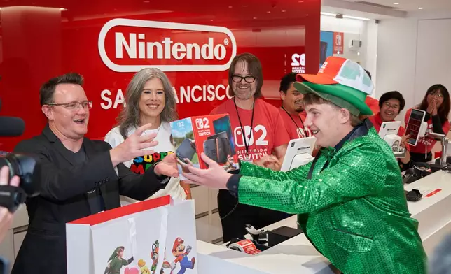 In this photo provided by Nintendo of America, Nintendo of America President Doug Bowser sells the very first Nintendo Switch 2 system to an eager fan following the midnight system launch at Nintendo NEW YORK in Rockefeller Plaza. Nintendo Switch 2, the seamlessly social, all-in-one Nintendo platform, is available now.