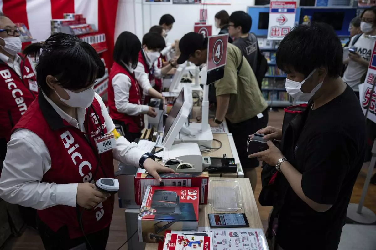 Customers lin up to purchase Nintendo Switch 2 at an electronics retailer in Tokyo, Thursday, June 5, 2025. (AP Photo/Louise Delmotte)
