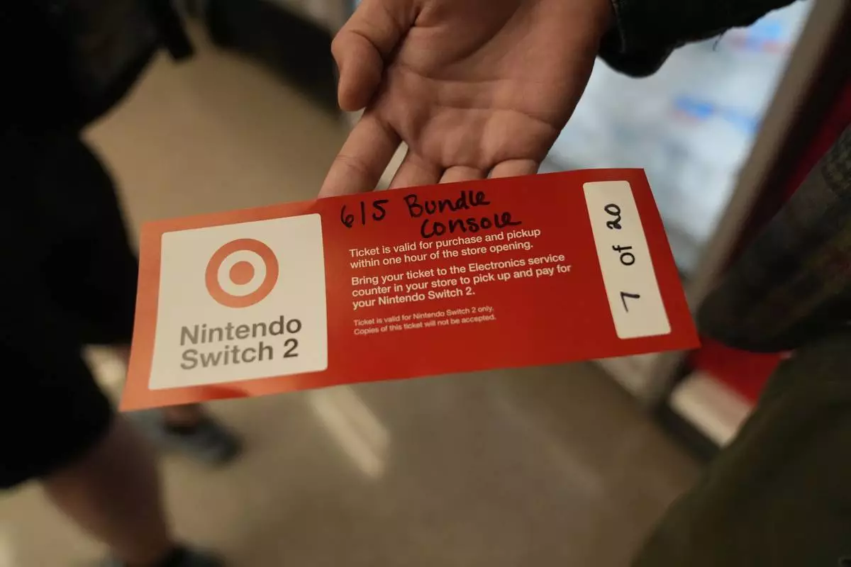 A customer presents a pre-order ticket for the new Nintendo Switch 2 video game console at a Target store on Thursday, June 5, 2025 in Chicago. (AP Photo/Kiichiro Sato)