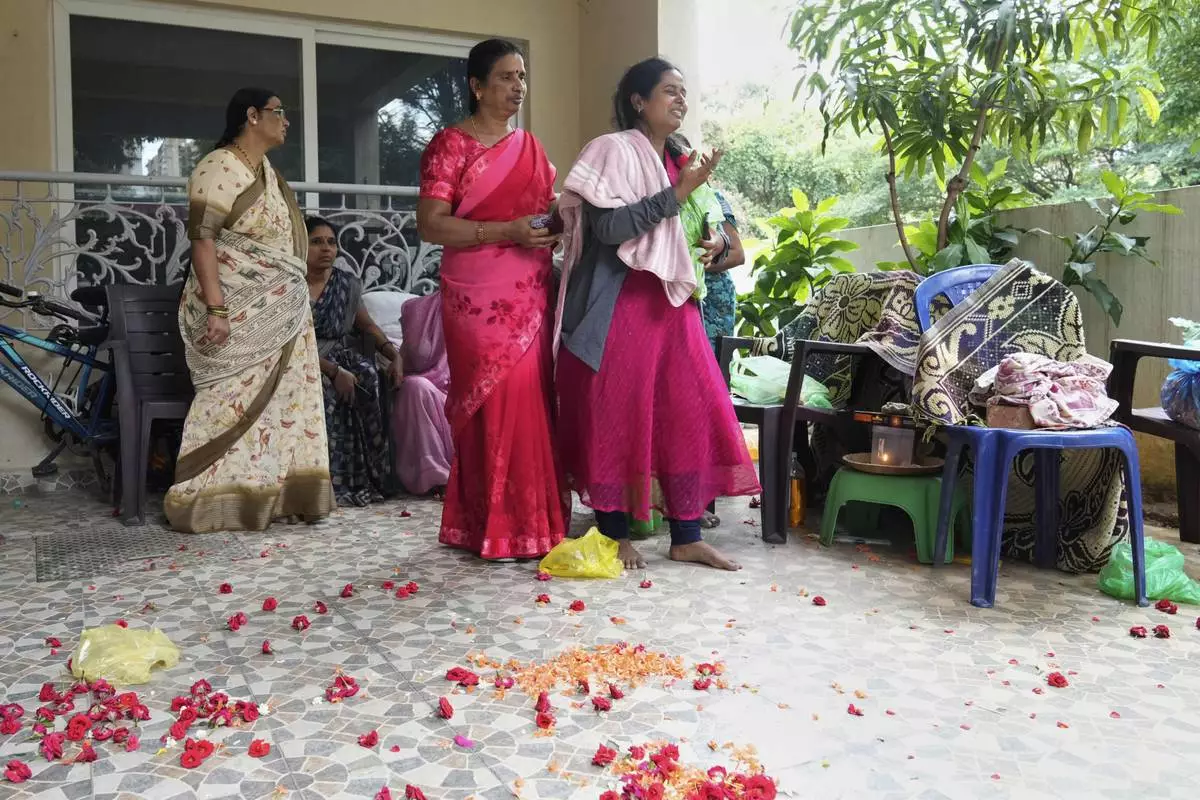 The body of 14-year-old Divyanshi Shivakumar, who lost her life in Wednesday's deadly stampede during celebrations outside a stadium for Royal Challengers Bengaluru, winners of the Indian Premier League, is placed at her residence ahead of her last rites in Bengaluru, India, Thursday, June 5, 2025. (AP Photo/Aijaz Rahi)
