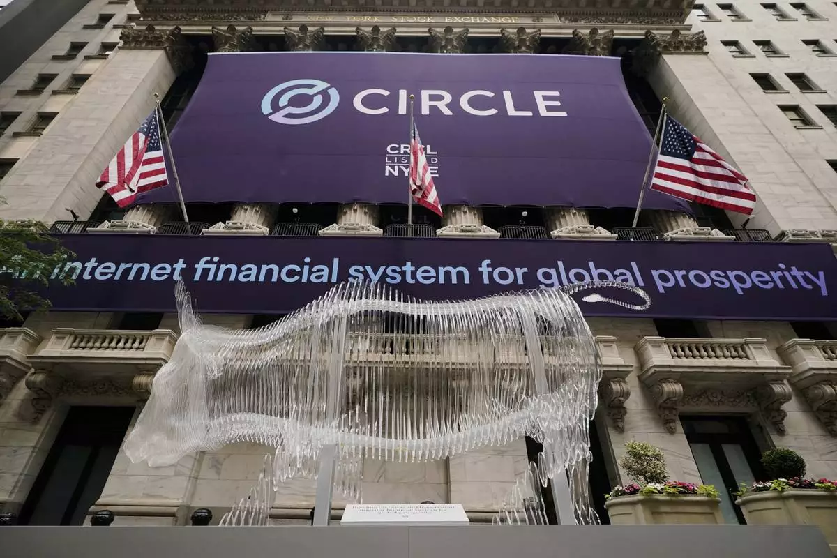A bull sculpture is displayed outside the New York Stock Exchange for the expected Circle IPO, Thursday, June 5, 2025. (AP Photo/Richard Drew)