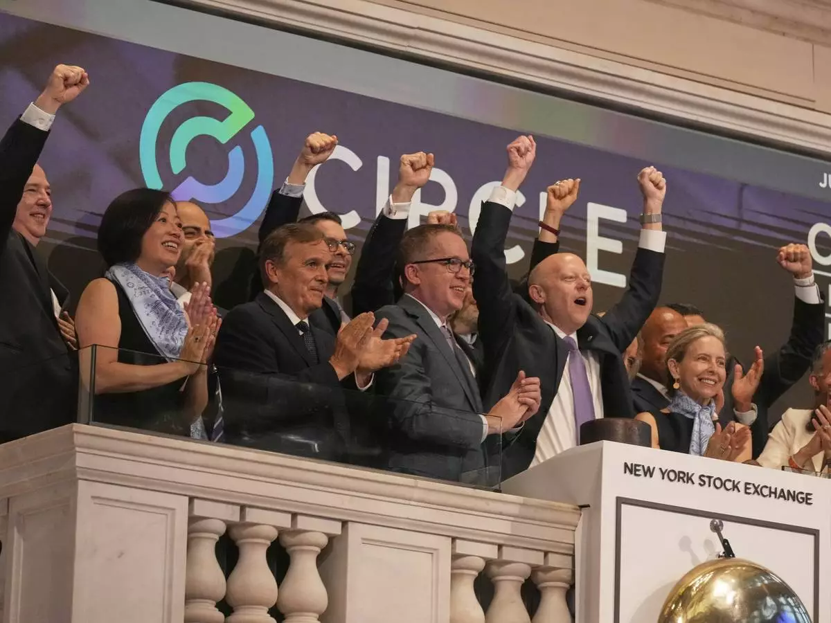 Jeremy Allaire, second from right, Co-Founder, Chairman & CEO of Circle, rings the New York Stock Exchange opening bell, Thursday, June 5, 2025. (AP Photo/Richard Drew)