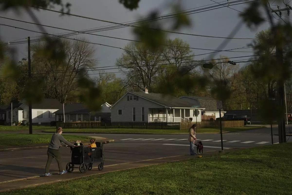 Kirt Ethridge, left, walks with his wife, Grace, right, and their daughters Thursday, April 10, 2025, in Evansville, Ind. (AP Photo/Joshua A. Bickel)