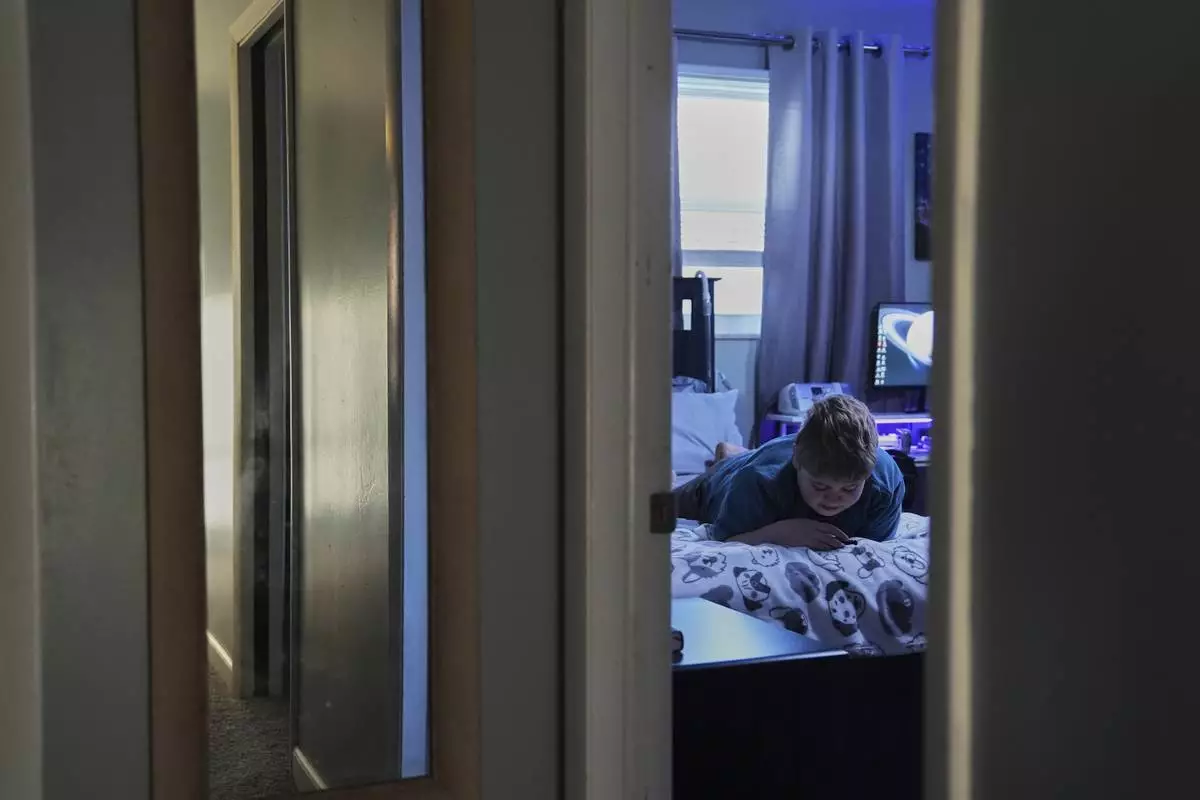 Julian Blazier relaxes in his bedroom Tuesday, April 8, 2025, in Bloomfield, Ind. (AP Photo/Joshua A. Bickel)