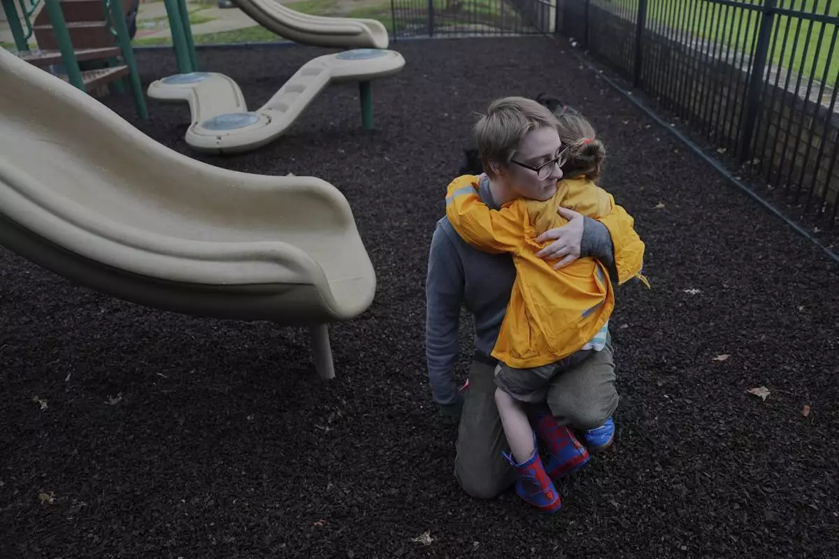 Kirt Ethridge hugs his daughter, Eliza, 5, while at a playground Thursday, April 10, 2025, in Evansville, Ind. (AP Photo/Joshua A. Bickel)