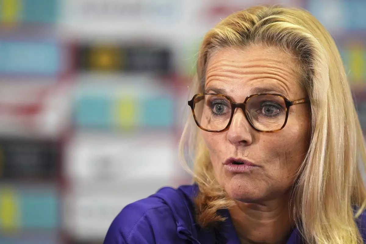 England women' soccer head coach Sarina Wiegman during a press conference at St George's Park, Burton upon Trent, England, Thursday June 5, 2025.(Martin Rickett/PA via AP)