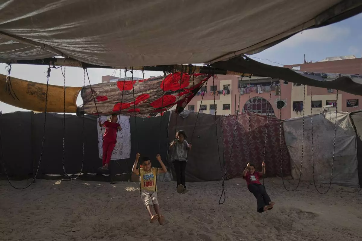 Displaced Palestinian children play on swings at a makeshift tent camp in Khan Younis, Gaza, on Wednesday, June 4, 2025. (AP Photo/Abdel Kareem Hana)