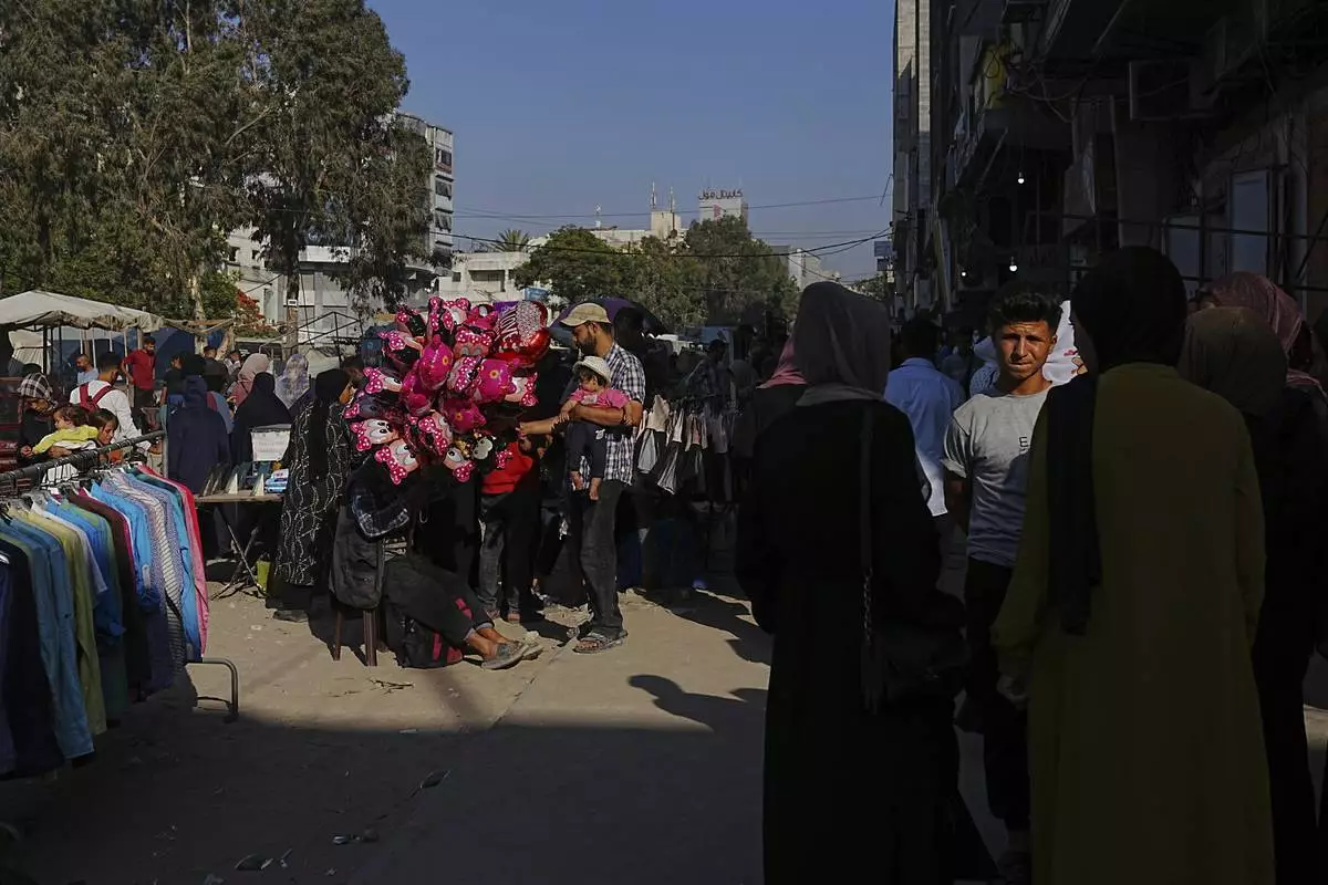Palestinians walk trough a market ahead of the Muslim holiday of Eid al-Adha, in Gaza City on Thursday, June 5, 2025. (AP Photo/Jehad Alshrafi)