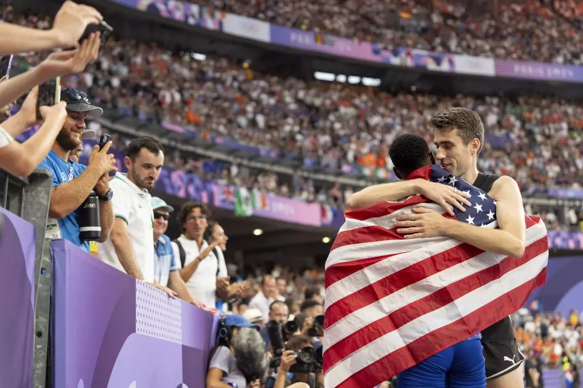 FILE - Hamish Kerr, of New Zealand, right, hugs Shelby McEwen, of the United States, after Kerr took gold and McEwen silver in the men's high jump at the 2024 Summer Olympics, Aug. 10, 2024, in Saint-Denis, France. (AP Photo/David Goldman, File)