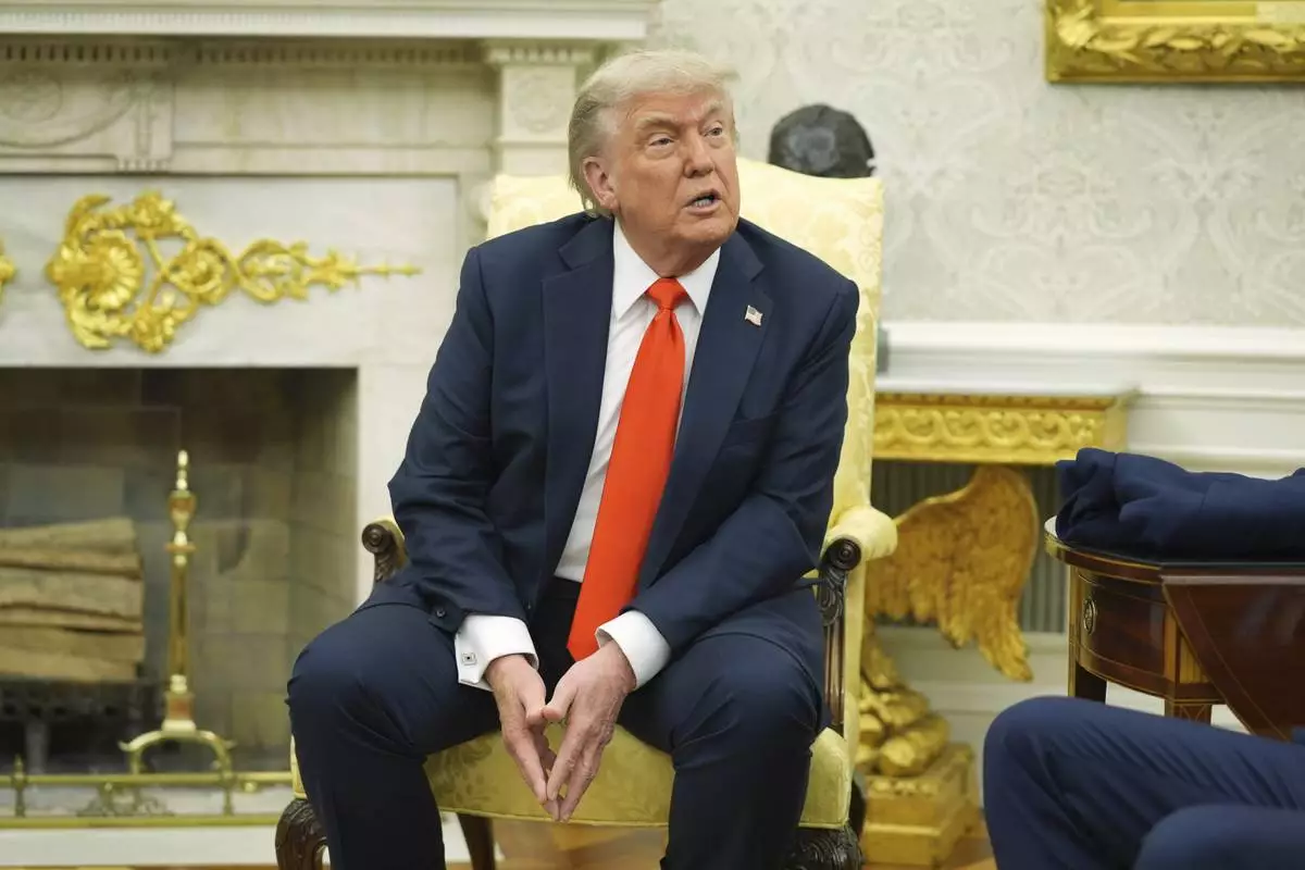 President Donald Trump speaks during a meeting with Germany's Chancellor Friedrich Merz in the Oval Office of the White House, Thursday, June 5, 2025, in Washington. (AP Photo/Evan Vucci)