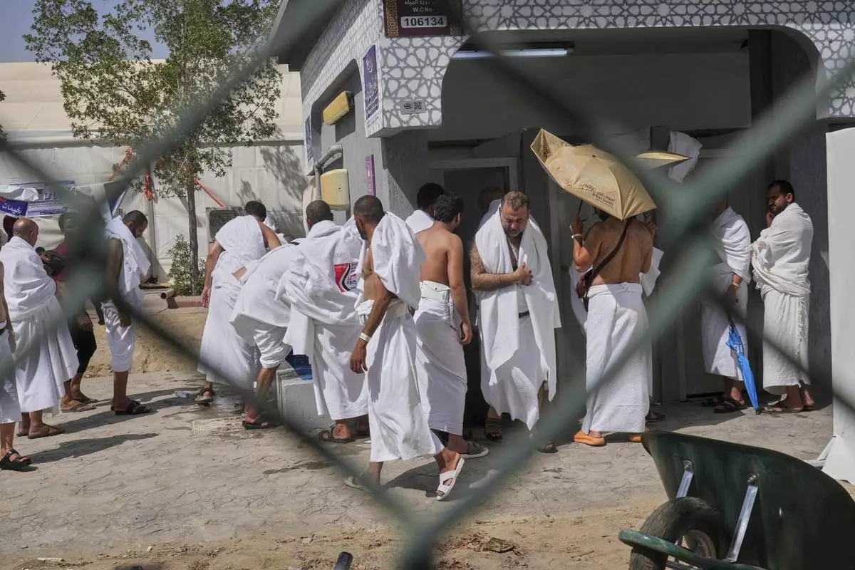 Pilgrims wash for prayers near the rocky hill known as the Mountain of Mercy, on the Plain of Arafat, during the annual Hajj pilgrimage near the holy city of Mecca, Saudi Arabia, Thursday, June 5, 2025. (AP Photo/Amr Nabil)
