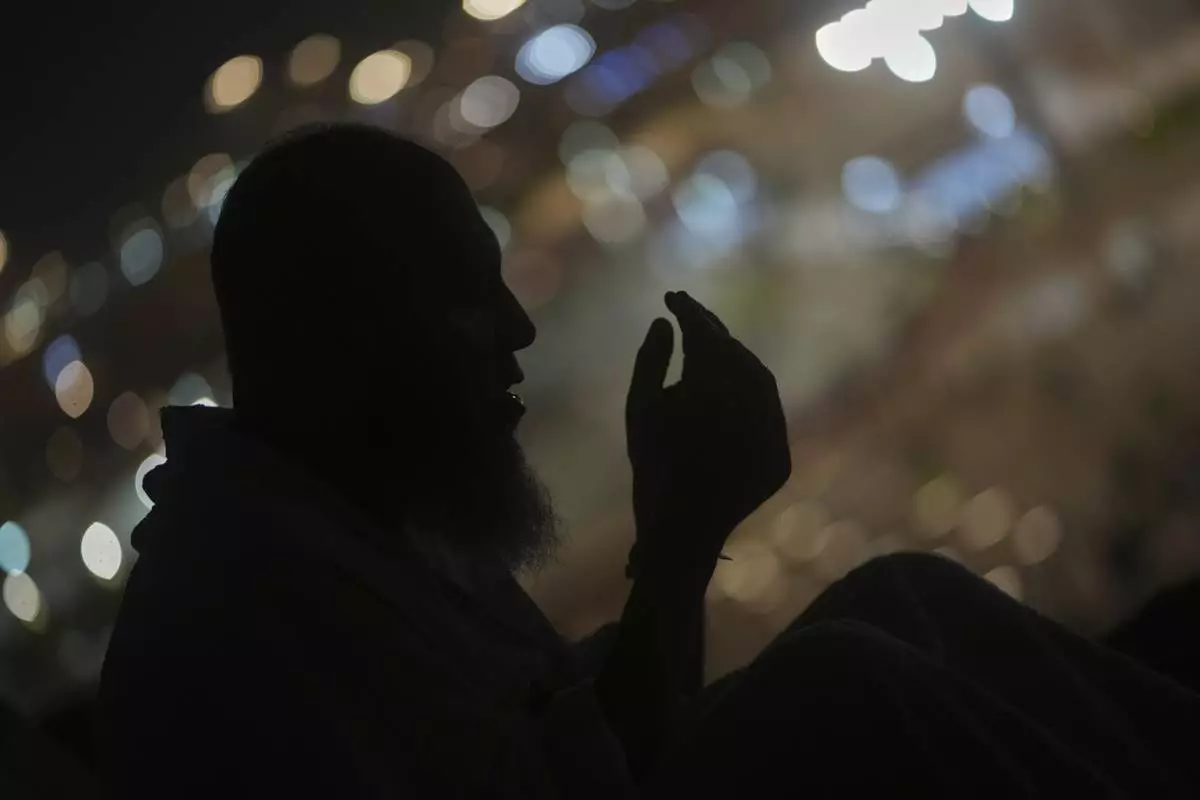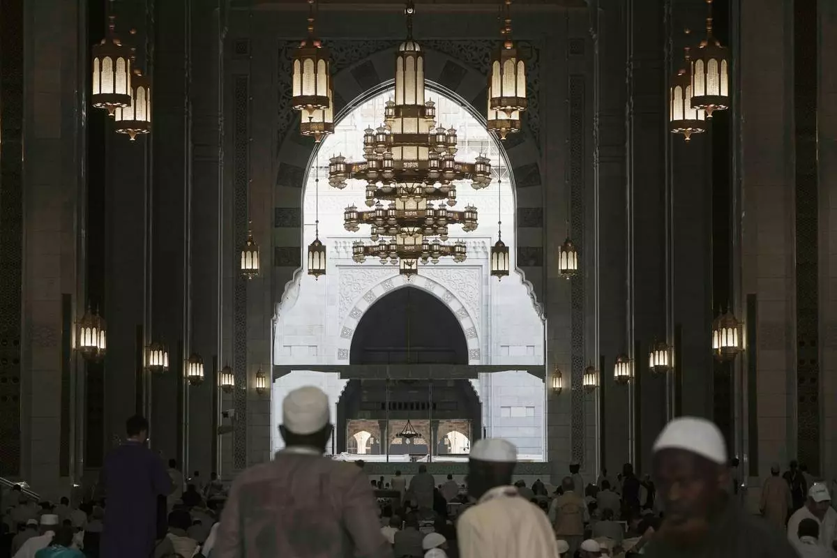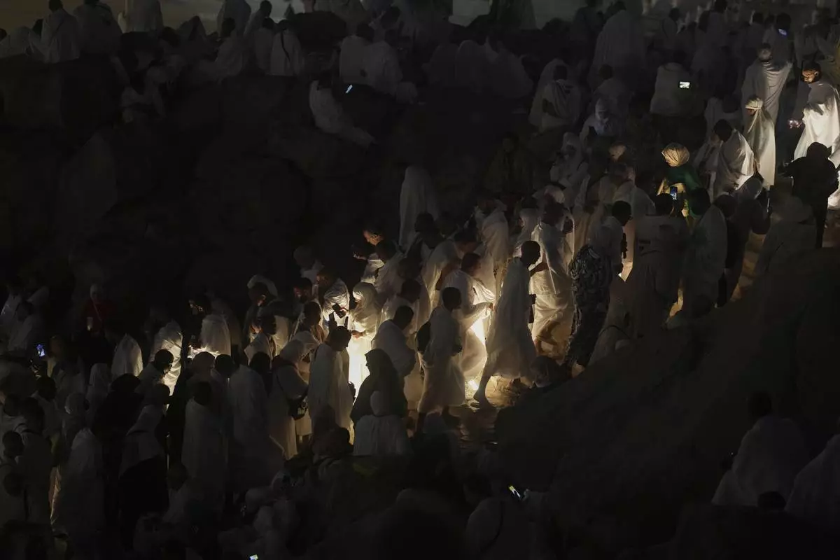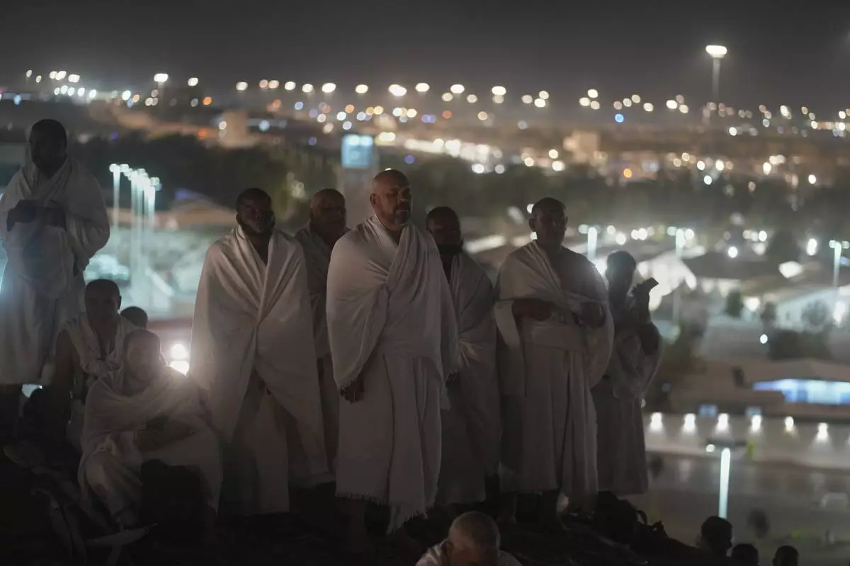 Muslim pilgrims leave the evening prayers outside the Grand Mosque, during the annual hajj pilgrimage in Mecca, Saudi Arabia, Monday, June 2, 2025. (AP Photo/Amr Nabi)