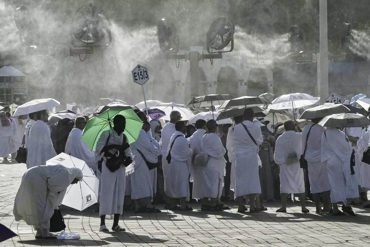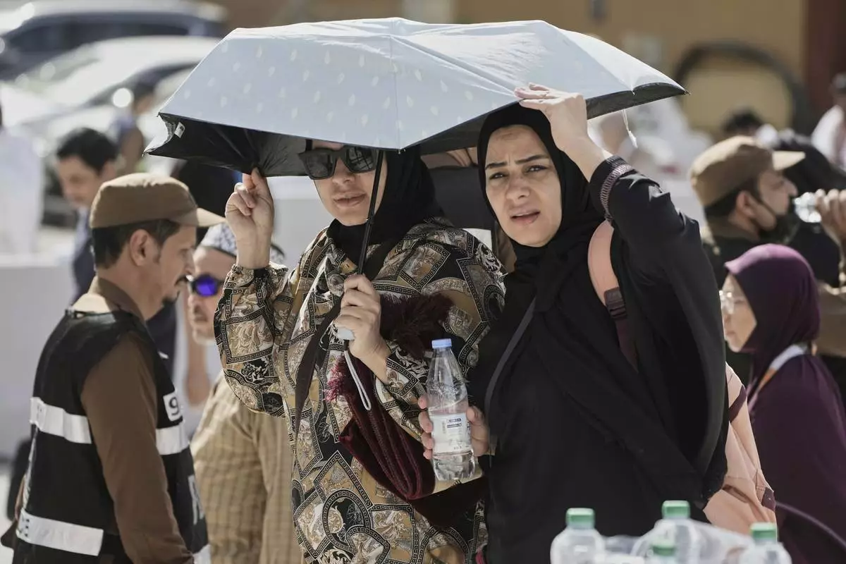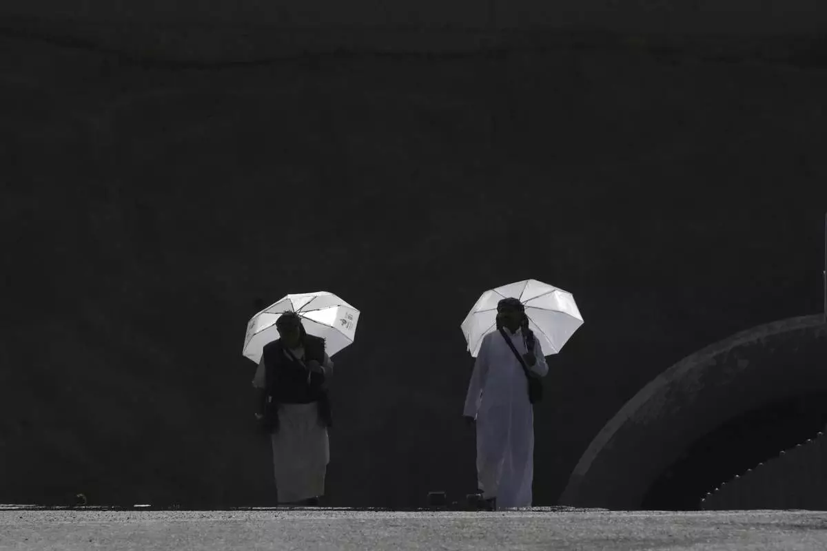 Egyptian pilgrims share an umbrella outside the Grand Mosque during the annual hajj pilgrimage at the holy city of Mecca, Saudi Arabia, Tuesday, June 3, 2025. (AP Photo/Amr Nabil)