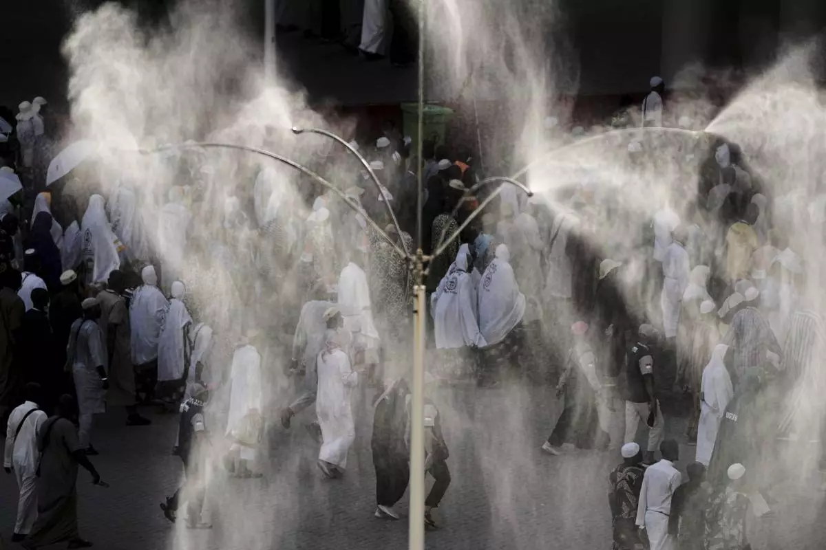 Cooling fans spray water over Muslim pilgrims as they walk to cast stones at pillars in the symbolic stoning of the devil, the last rite of the annual Hajj, in Mina near the holy city of Mecca, Saudi Arabia, Saturday, June 7, 2025. (AP Photo/Amr Nabil)