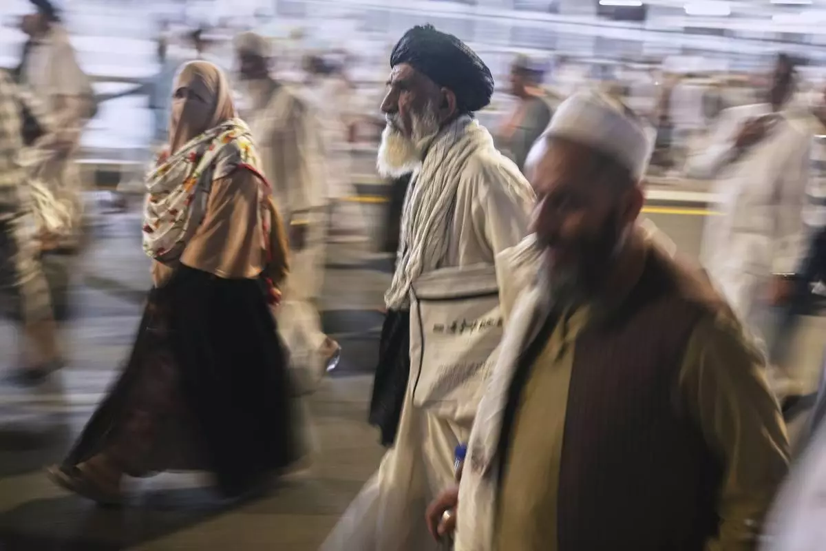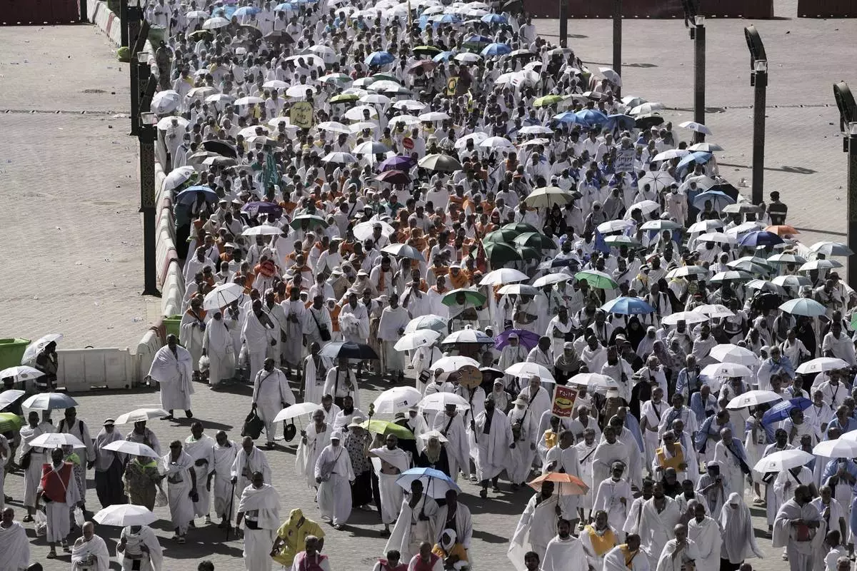 Muslim pilgrims walk to cast stones at pillars in the symbolic stoning of the devil, the last rite of the annual Hajj, in Mina near the holy city of Mecca, Saudi Arabia, Saturday, June 7, 2025. (AP Photo/Amr Nabil)