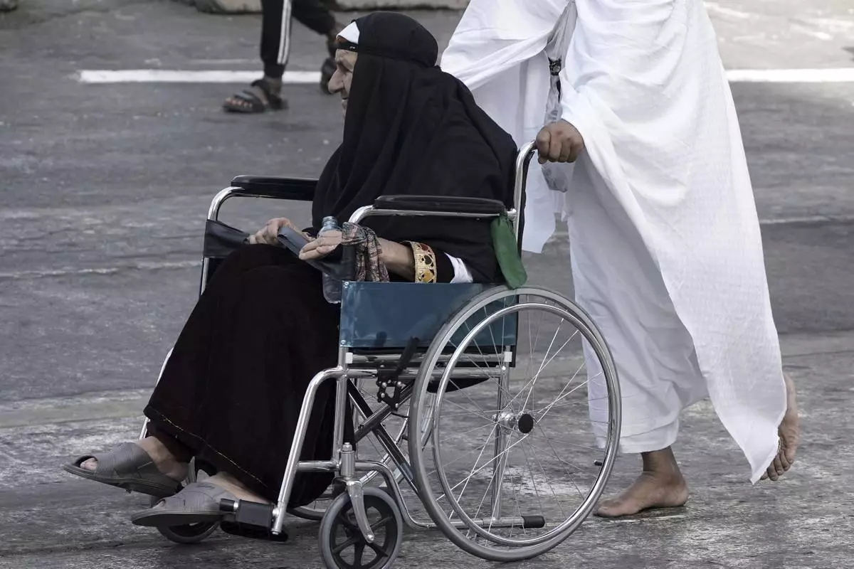 An Afghan elderly pilgrim on a wheel chair is pushed by her son, during the annual hajj pilgrimage in Mecca, Saudi Arabia, Tuesday, June 3, 2025. (AP Photo/Amr Nabil)