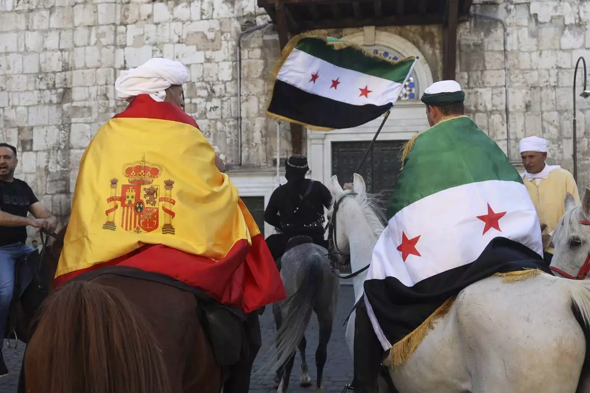 Pilgrims, including three from Spain, visit the Umayyad Mosque during a months-long horseback journey from Spain to Saudi Arabia to perform the Hajj, in Damascus, Syria, April 21, 2025. (AP Photo/Omar Albam)
