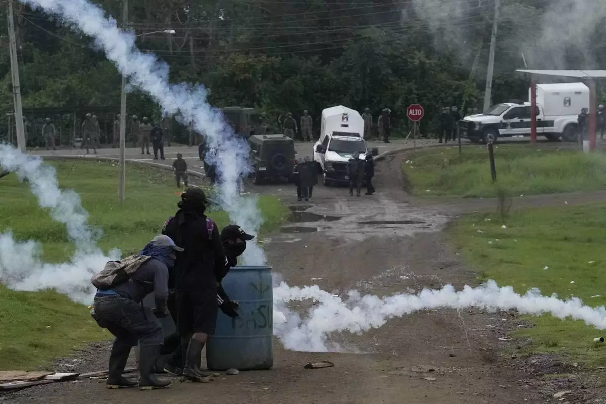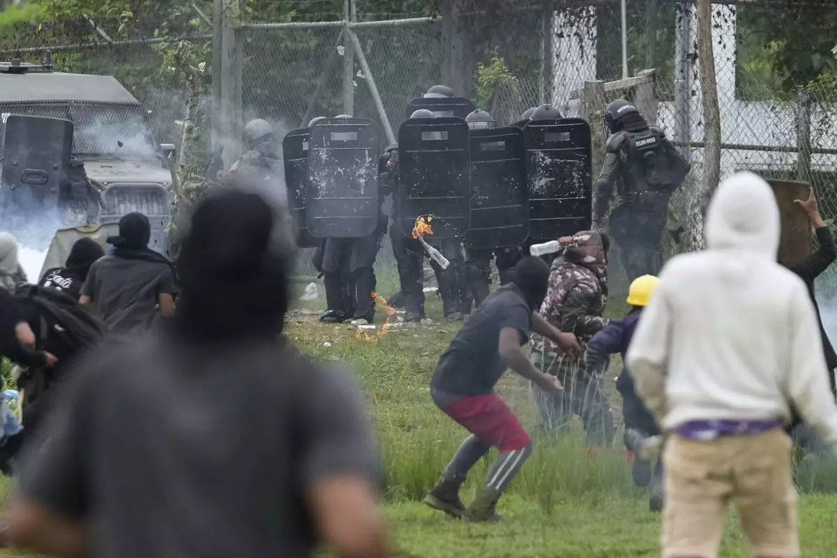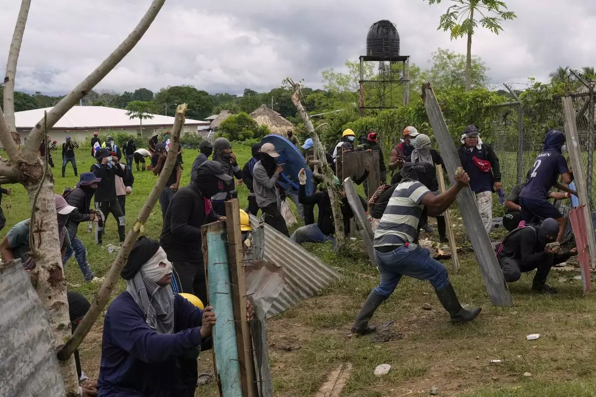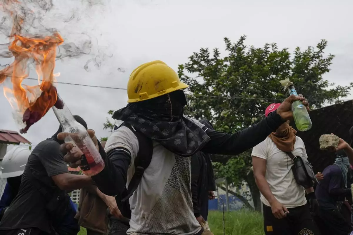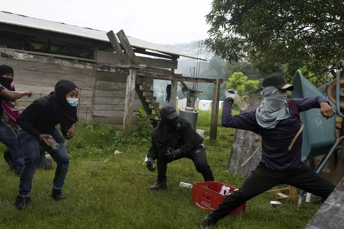 Demonstrators clash with police during protests against President Jose Raul Mulino's government in the Indigenous Embera community of Arimae, Panama, Thursday, June 5, 2025. (AP Photo/Matias Delacroix)